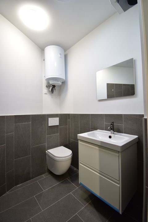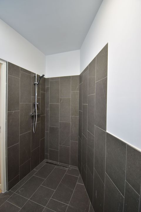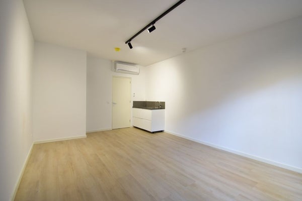 Slaap/woonruimte van 24m² met een grote raampartij welke uitkijkt op de patio. Deze ruimte is voorzien van een moderne vloer, gestucte wanden, fraaie lampen en een pantry. De badkamer van ca. 4,2m² is voorzien van een inloopdouche, wastafel met meubel en een frisse strakke uitstraling.