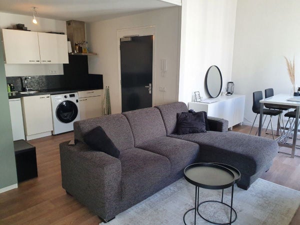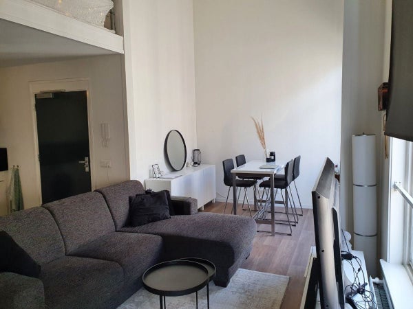 binnenkomst in woonkamer met open keuken. Het hoge plafond en grote ramen maken de woonkamer een fijne, lichte ruimte om in te verblijven. De woning is voorzien van vloeren.