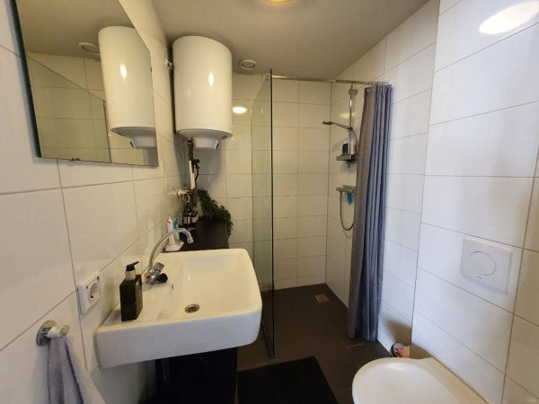 moderne badkamer voorzien van toilet, wastafel en douche.
