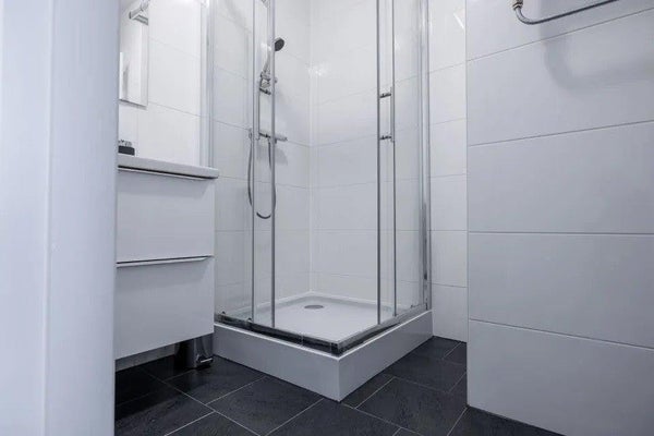 Comfortabel bed met beddengoed. Luxe badkamers met inloopdouche en modern tegelwerk.