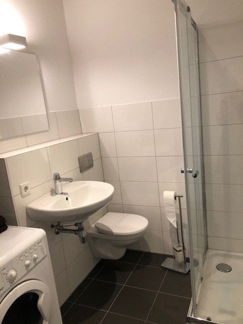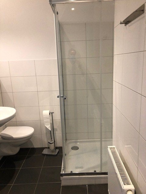 Moderne lichte badkamer voorzien van douche, toilet en wastafel.