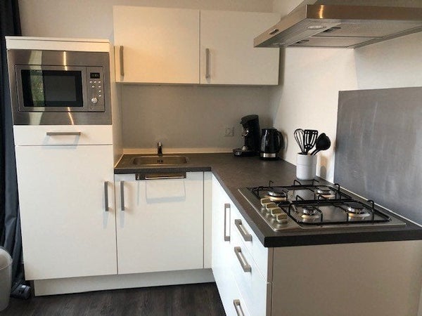 Voorzien van luxe keuken met spoelbak, gaskookplaat, afzuigkap, combi-magnetron en koelkast met vriesvakje.