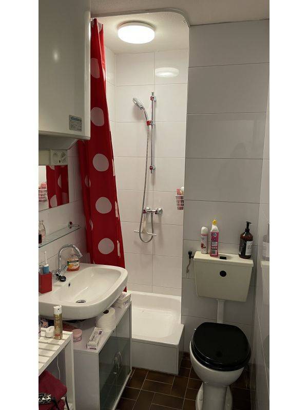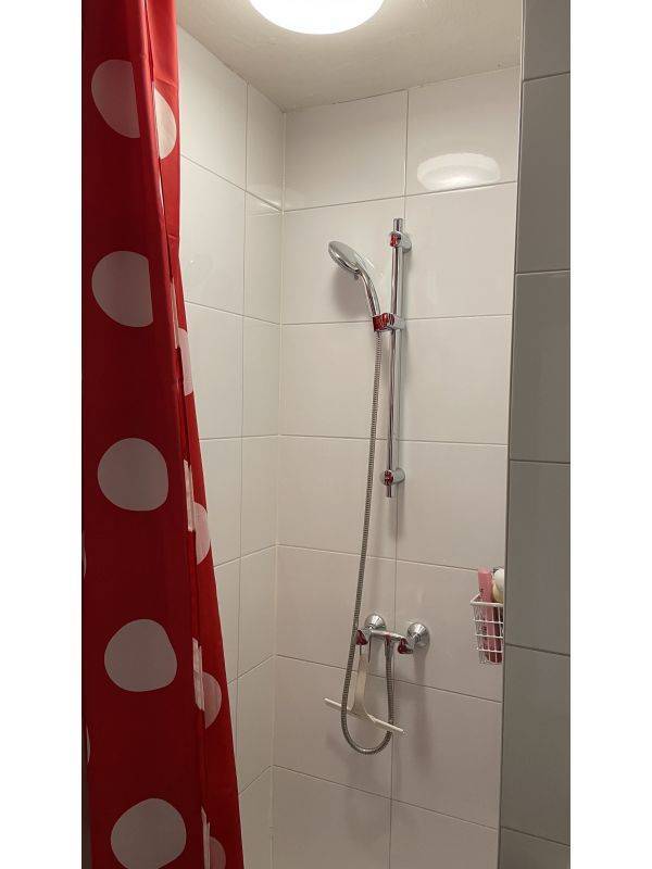 Badkamer met wastafel, douche en toilet.