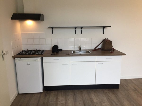 Entree in voorportaal met toegang tot 3 woonruimte. Entree in studio van ca. 30 m² voorzien van laminaat vloer. Keuken voorzien van koelkast met vriezer, gasfornuis en afzuigkap. Badkamer met wastafel, toilet en douche. De badkamer is voorzien van tegelvloer.