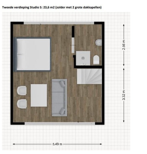 Studio 5: 23,6 m2 (zolder met 2 grote dakkapellen)