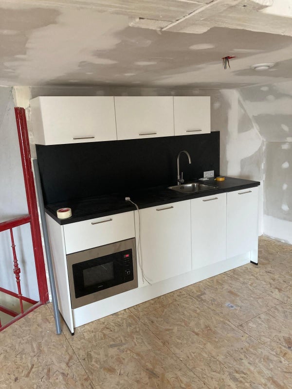 Woonkamer met open keuken. De luxe keuken is uitgerust met inbouwapparatuur (elektrische kookplaat, afzuigkap, vaatwasser, koel-vriescombi). Badkamer met douche, wastafel en spiegel met ingebouwde verlichting.