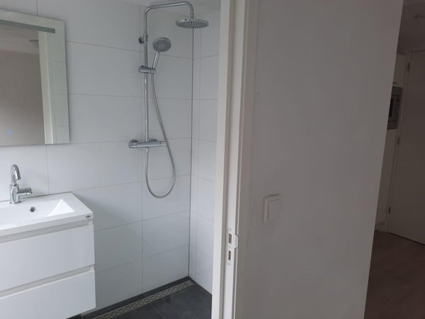 De studio heeft een open keuken. De keuken is uitgerust met inbouwapparatuur (elektrische kookplaat, afzuigkap, koel-vriescombi). Badkamer met inloopdouche, wastafel en spiegelkast.