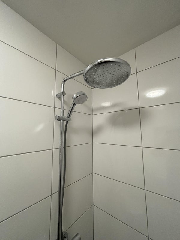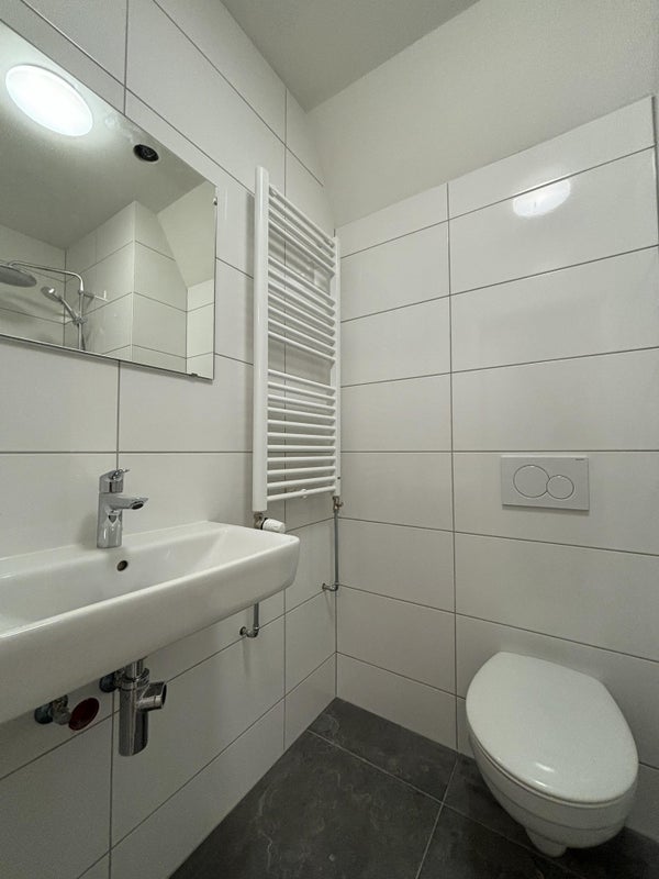 De badkamer is verwarmd en beschikt over een design-radiator, douche, toilet en wastafel.