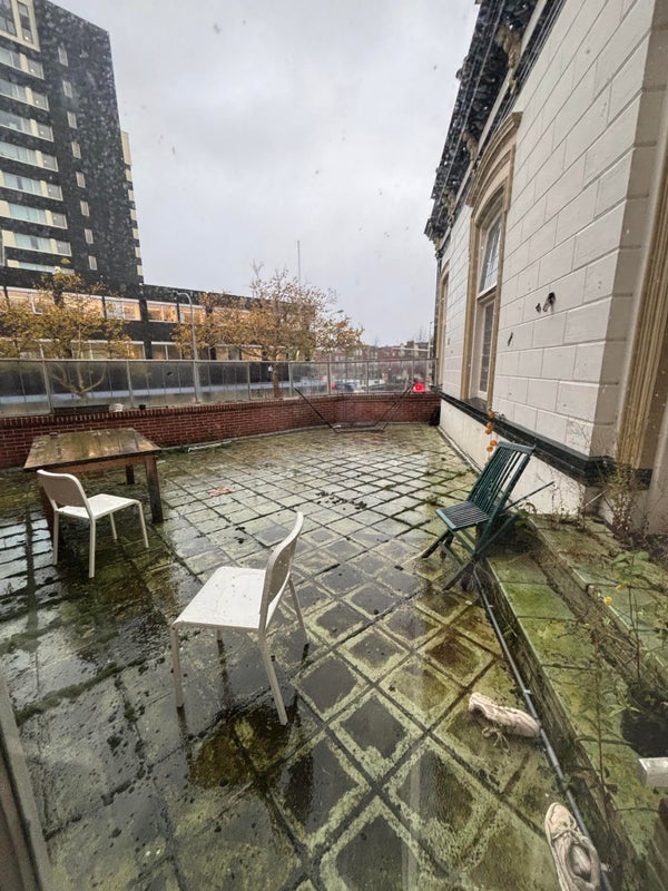 De studio bevindt zich op de eerste etage van het pand. Er is een woon/slaapkamer aanwezig en een aparte keuken met directe toegang tot het ruime prive-dakterras. Badkamer met douche, wastafel en hangend toilet.