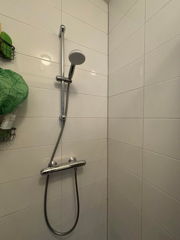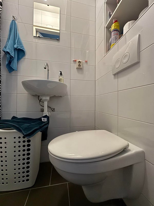 De badkamer is voorzien van een zwevend toilet, inloopdouche en wastafel.