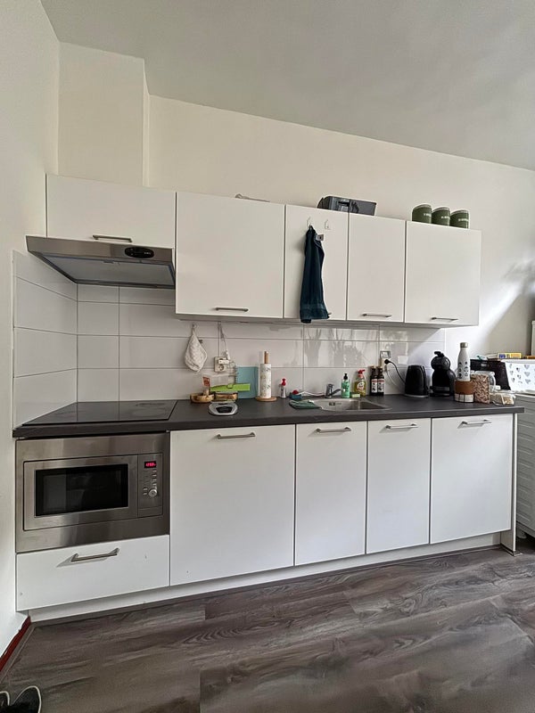 De keuken is voorzien van o.a. een koelkast, combi-magnetron, vaatwasser, inductiekookplaat en wasemkap.