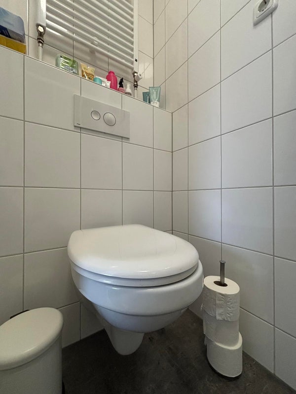 De badkamer is voorzien van een douche, toilet, wastafelmeubel en handdoekenradiator.