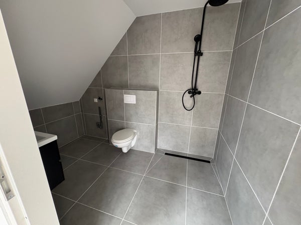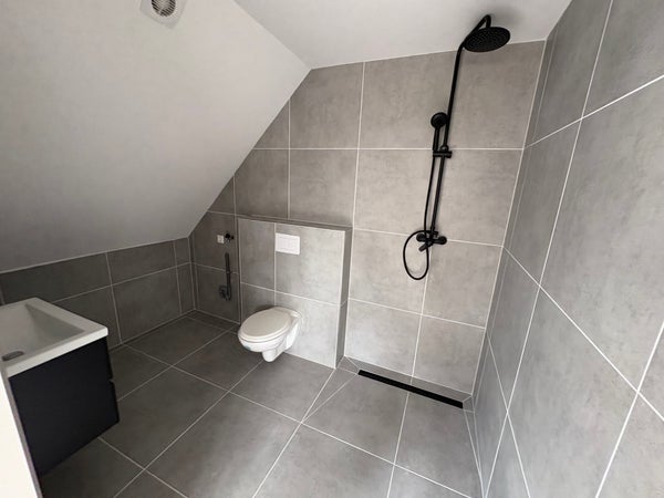 De badkamer is voorzien van een douche, wastafel en hangtoilet. Ten slotte is er buiten aan de zijkant van het pand een ruime berging aanwezig