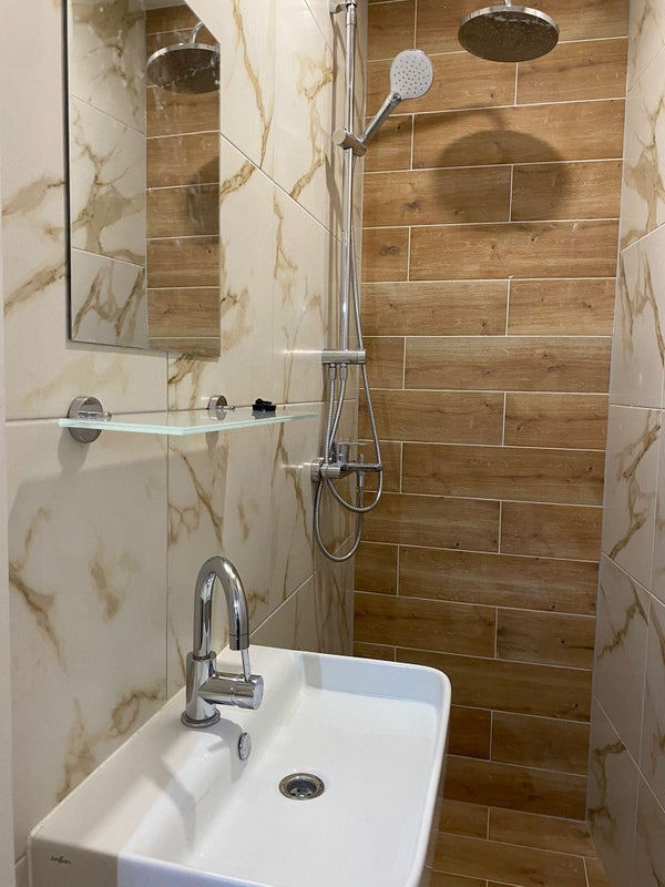 - Badkamer is volledig nieuw betegeld, beschikt over een wastafel en spiegel