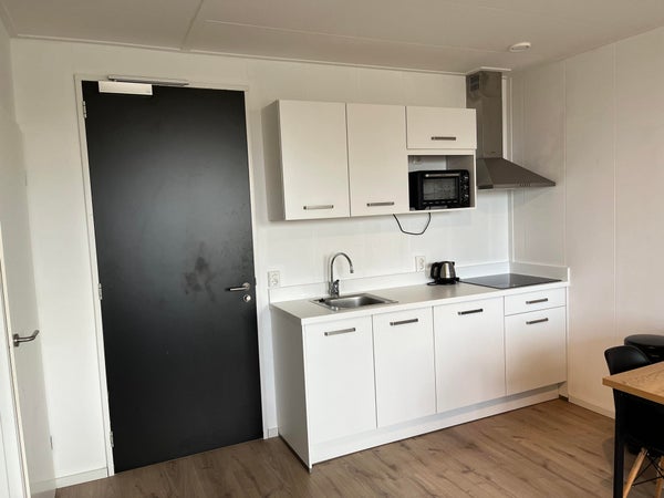 De studio is zelfstandig is afgerond 27 vierkante. De keuken beschikt over een inductiekookplaat met daarboven een afzuigkap een ingebouwde koelkast met vriezervakje en voldoende opbergruimte. De badkamer heeft een hangend toilet, een wastafel met daarboven een stopcontact en een volledig afgesloten douchecabine.