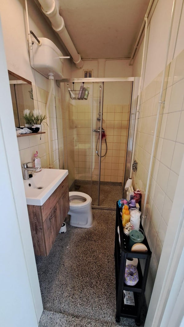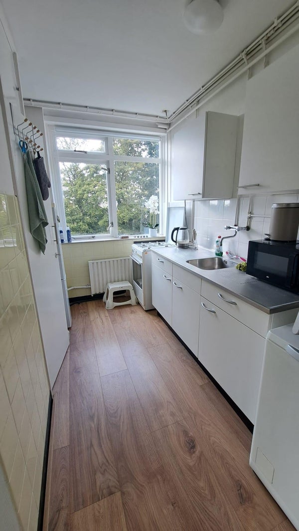 Je komt binnen in de hal. Vanuit hier heb je toegang tot de badkamer, aparte keuken en woon/slaapkamer. De badkamer beschikt over een aparte douche, toilet en een wastafel(meubel). De keuken heeft aansluiting voor een wasmachine en beschikt over een koelkast, kookplaat en oven.