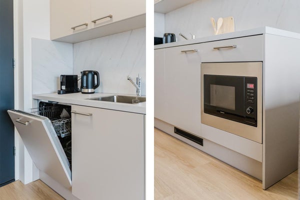Begin je dag fris en ontspannen in je eigen badkamer, inclusief een douche, wastafel met spiegel en toilet. Naast je eigen badkamer heb je ook je eigen volledig uitgeruste keuken om een heerlijk ontbijtje in klaar te maken. Na je lessen is de kleine loungehoek de perfecte plek om in je studieboeken te duiken of te ontspannen.