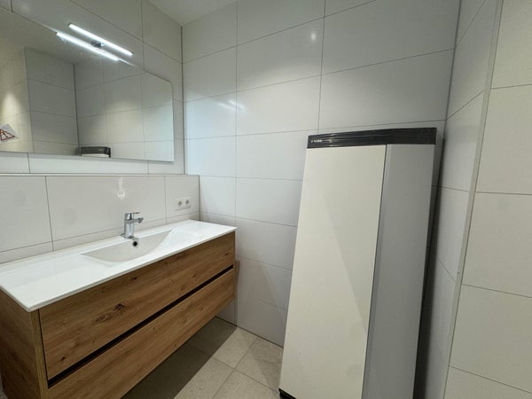 De badkamers zijn strak afgewerkt met ruime douche, verlichte spiegel en moderne sanitairvoorzieningen.