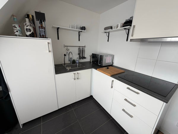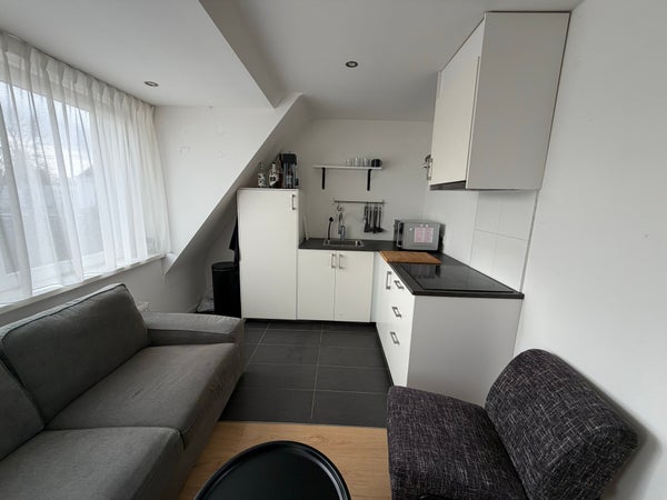 De studio beschikt over een eigen keuken/woonkamer/slaapkamer - uitgerust met een koel-vries combinatie, inductiekookplaat en afzuiging. Het appartement beschikt over een ruime badkamer met toilet waar ook de aansluiting van de wasmachine is voorzien.
