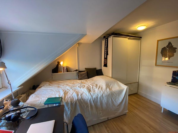 Te huur semi-gemeubileerde studio in centrum Maastricht (Wyck) van circa 22m2 gelegen op de 2e verdieping. Entree in klein halletje dat toegang geeft tot de badkamer v.v. toilet, douche cabine en vaste wastafel. Badkamer is wit betegeld met zwarte vloertegel. Keukenunit v.v. koelkast, 2-pits kookstel en opbergkast.