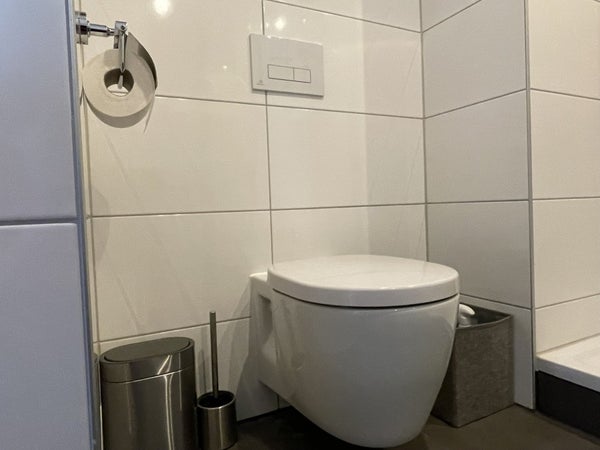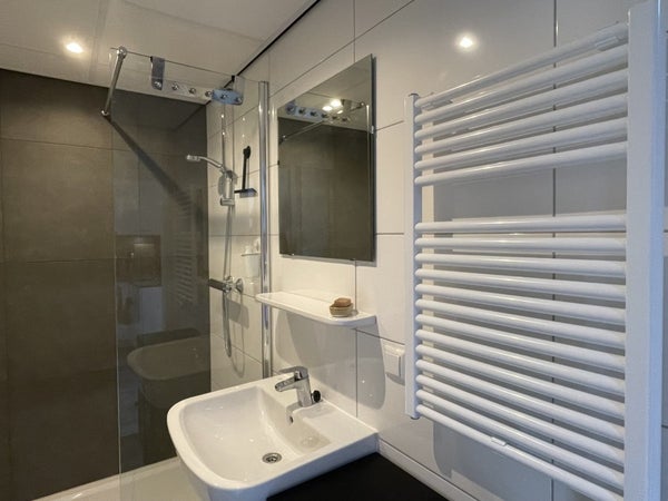 De badkamer is voorzien van zwevend toilet, douche met douchegarnituur en douchescherm.