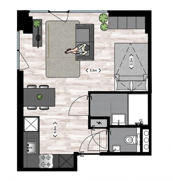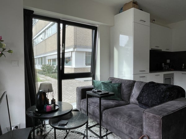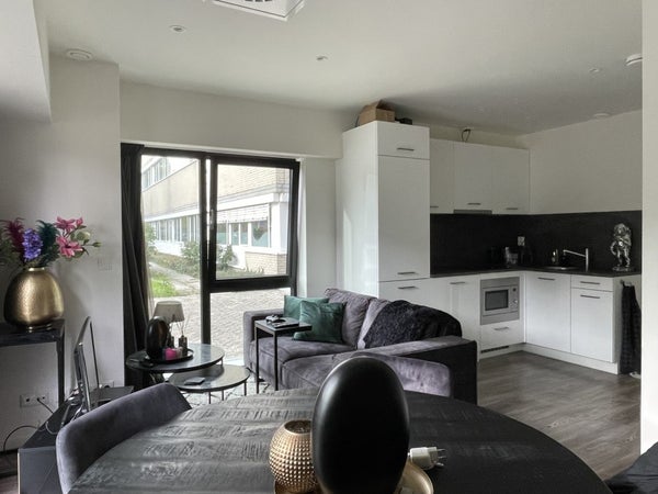 De studio is volledig gestoffeerd en slim ingedeeld, waardoor de ruimte optimaal wordt benut. De moderne hoekkeuken is uitgerust met hoogwaardige inbouwapparatuur, waaronder een koel-vriescombinatie, keramische kookplaat, combimagnetron en afzuigkap. De badkamer beschikt over een zwevend toilet, een moderne douche met glazen douchescherm en kwalitatief sanitair.