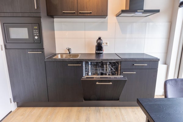 De studio beschikt over een nette keuken, een eigen badkamer met douche en toilet, en een slimme inrichting die optimaal gebruik maakt van de ruimte. Er is een gemeenschappelijke wasmachine en droger.