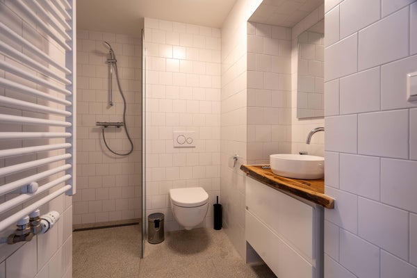 Aan de ploegstraat kun je via de authentieke trappenhal naar de bovenste verdieping van het voormalige conciërgewoning. In deze ruime studio zijn de oude details zoveel mogelijk behouden gebleven. De keuken is voorzien van moderne apparatuur, waaronder een combimagnetron en vaatwasser. De nieuwe en elegante badkamer beschikt over een inloopdouche, toilet en wastafel met spiegel.