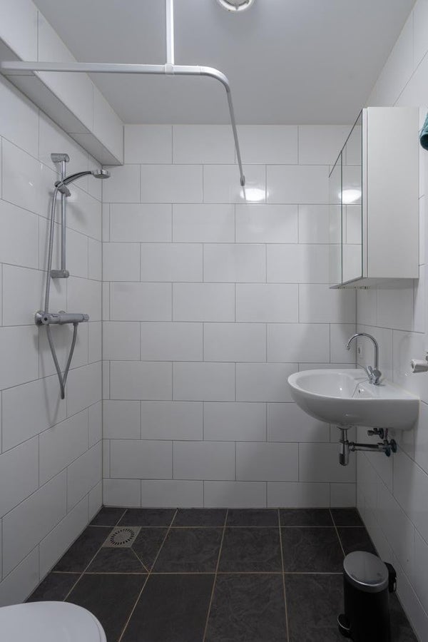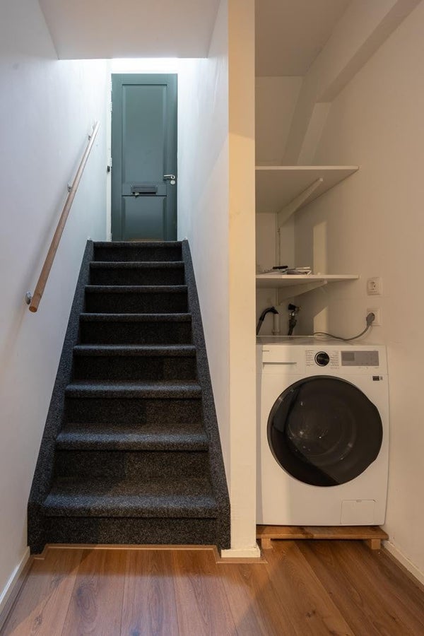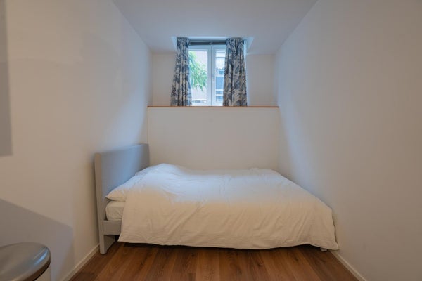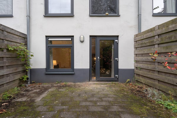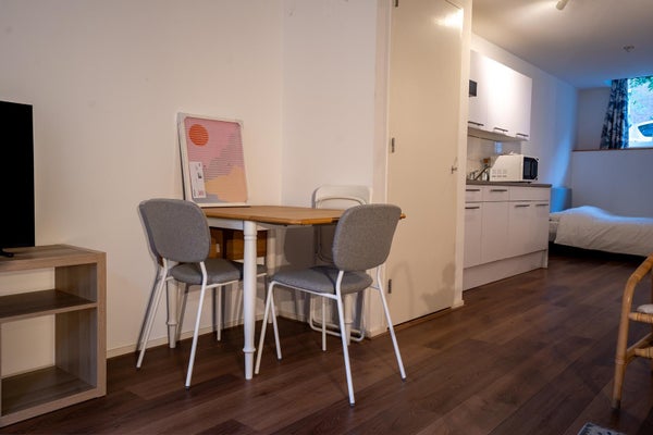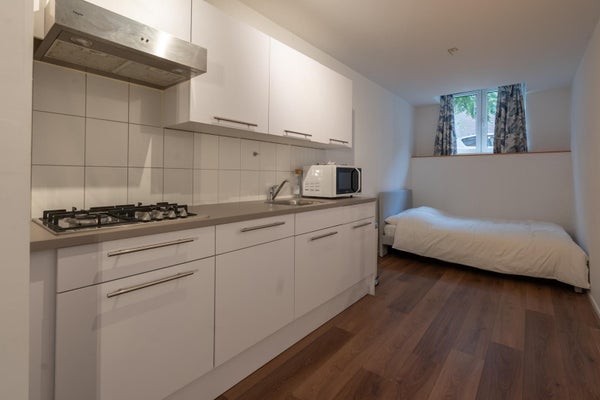 De woon/slaapkamer met open keuken (ca 30 m2) is voorzien van ramen aan de voor- en achter zijde en een deur met toegang tot de privé achtertuin. De badkamer is volledige afgewerkt met een douche, toilet, wastafel en handdoekradiator. In de hal bevindt zich tevens ruimte voor een wasmachine.