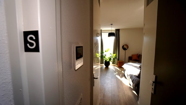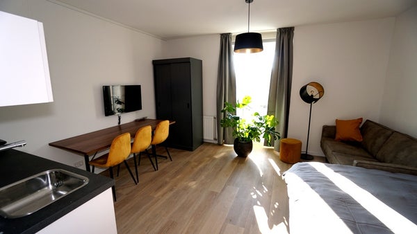 Indeling:Gedeelde entree met brievenbussen, bellentableau, lift en toegang tot de gezamenlijke tuin. De studio is uitgerust met hip meubilair, oa. een tweepersoonsbed, linnenkast, tafel, stoelen, TV. De open keuken is voorzien met een kooplaat, afzuigkap, koelkast en magnetron. De volledig betegelde badkamer is voorzien van een douche en wastafel met spiegel.De studio is geschikt voor 1 person.De huurprijs is incl. voorschot voor gas, electriciteit en water, exclusief tv en internet.