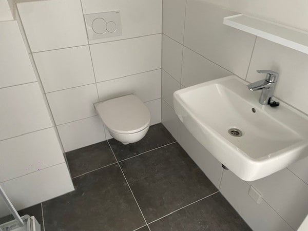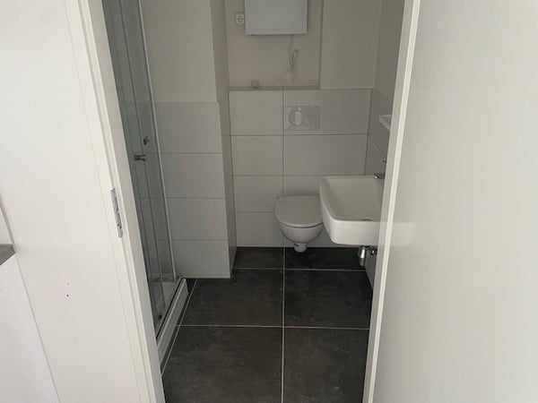 Moderne badkamer, met toilet, douche en wastafel.