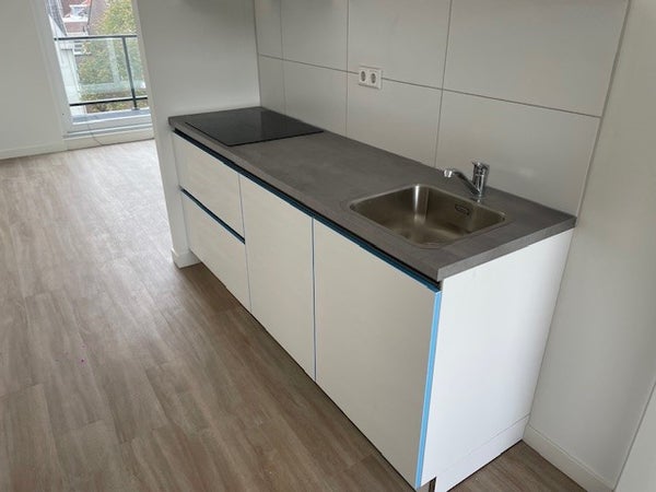 De keuken is uitgerust met combi-oven, greeploze keukenkastjes, inductie kookplaat, koelkast ( zonder vriesvak ) en afzuigkap.