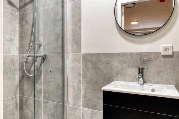 De slaapkamer is voorzien van een bed met alle voorzieningen. Daarnaast heb je ook een nachtkastje en een kast voor je kleding. De moderne badkamer beschikt over een inloop douche, wastafelmeubel en een luxe uitstraling dankzij het gebruik van natuurlijke tinten.
