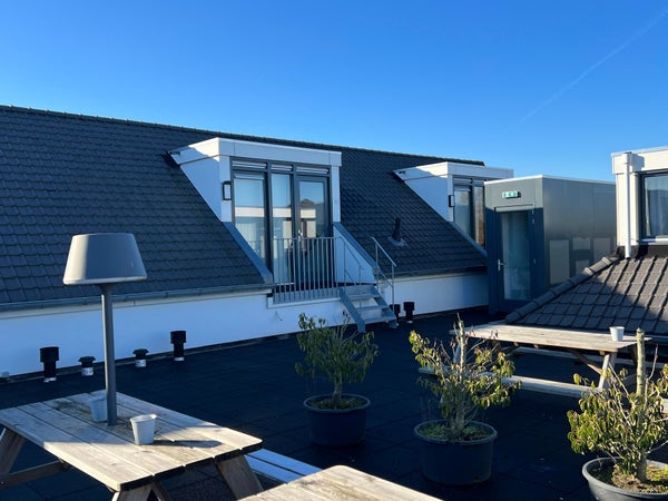 De woonkamer geeft toegang tot prive terras uitkijkend over het achterterrein. Verder beschikt de studio over een eigen parkeerplaats op afgesloten terrein.