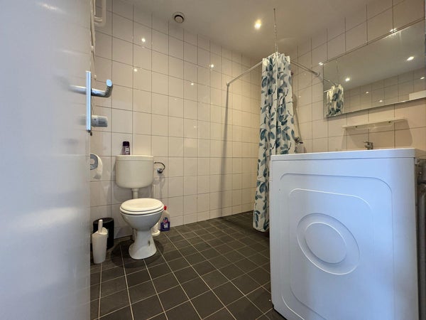 De studio beschikt over een moderne badkamer met douche, wastafelmeubel, toilet en wasmachine-aansluiting. De keuken is compact maar compleet ingericht en biedt voldoende opbergruimte.